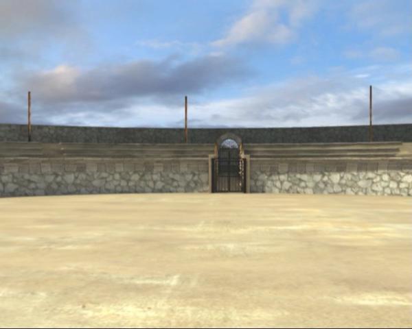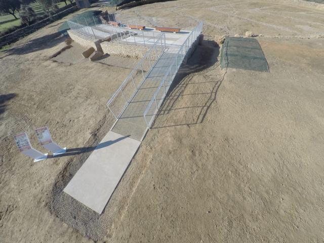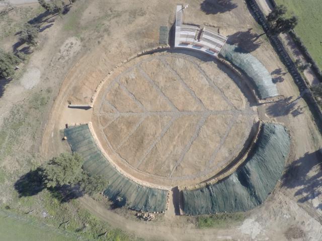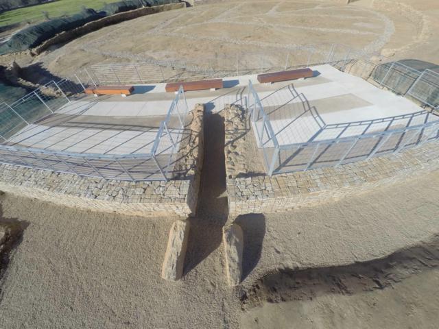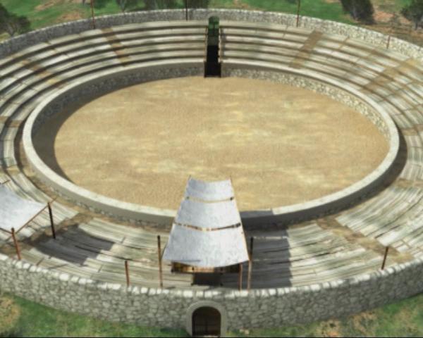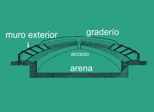 En anfiteatro está definido por la construcción de un doble muro de piedra que lo cierra al exterior y que delimita el espacio interior (la denominada arena) en el que tenían lugar los espectáculos. De acuerdo a los datos facilitados por las excavaciones la altura aproximada del edificio era de tres metros. El edificio contaba con cuatro puertas, de las cuales dos (las que corresponden al eje mayor) son puertas monumentales, destinadas a la entrada y salida de los cortejos ceremoniales con los que comenzaban y finalizaban este tipo de espectáculos. Toda la edificación fue realizada con piedra y rellenos de tierra compactada, si bien las zonas de asiento para los espectadores debieron construirse, utilizando estructuras de madera.
