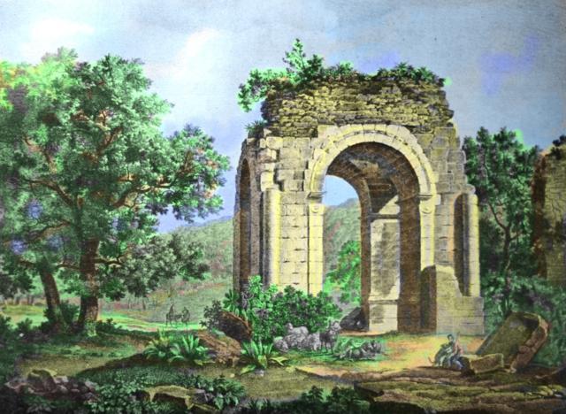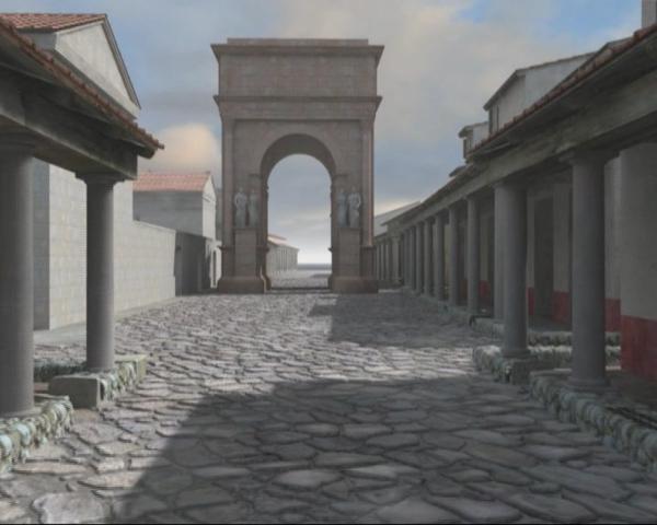 Al exterior del frente occidental todavía de puede contemplar la inscripción dedicatoria de Marcus Fidius a la memoria de sus antepasados.