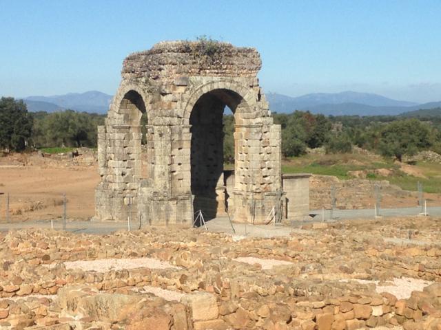 El denominado popularmente “arco de Caparra”, es realidad un edificio formado por cuatro pilares macizos que sustentan arcos de medio punto, característicos de la arquitectura romana, que se prolongan en bóvedas de cañón, enfrentadas, destinadas a sustentar un ático también macizo y plano, a modo de cubierta. Se trata de un edificio único en el amplio repertorio de la arquitectura romana en España. Fue elevado a finales del siglo I después de Cristo, cuando la ciudad de Caparra alcanza el rango de Municipio romano. Para su construcción, pagada por un relevante ciudadano caparense llamado Marco Fidio Macer, que lo dedicó a la memoria de sus padres, se eligió un punto central en el que se cruzan las dos vías más importantes de la ciudad. Servía además como acceso monumental a la plaza.