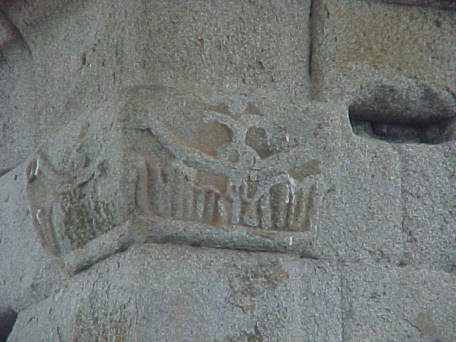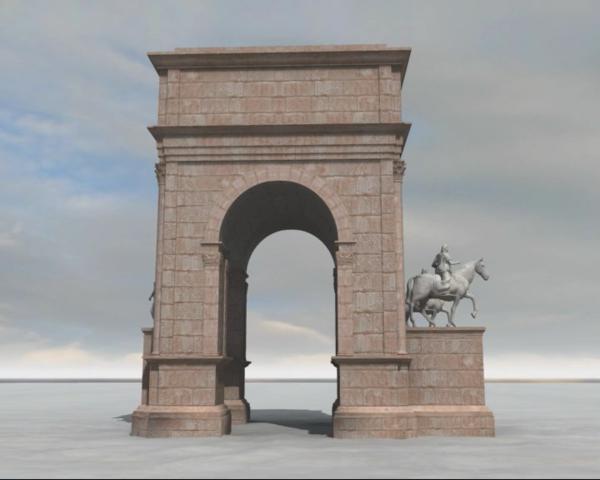En origen, el ático, del que hoy podemos contemplar su núcleo interior de hormigón, estuvo rematado por una cubierta plana y revestido en sus cuatro frentes por placas de mármol blanco. Todo el edificio está realizado con bloques de granito teñidos en su origen de color rojo y en el arranque de los arcos, al interior, conserva motivos decorativos en forma de guirnaldas.