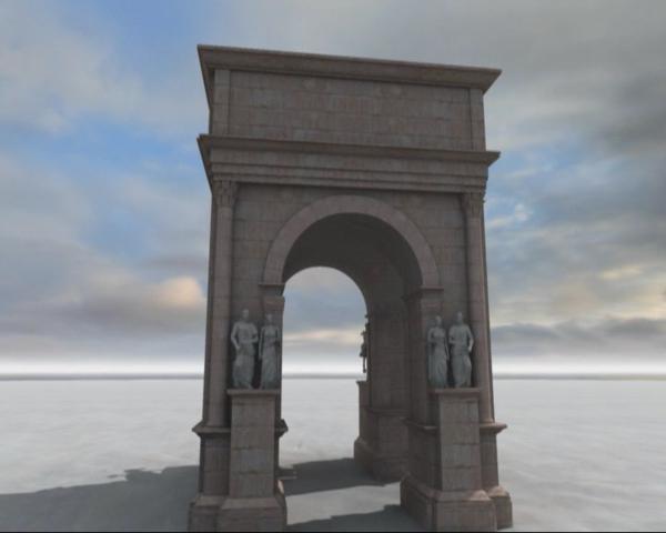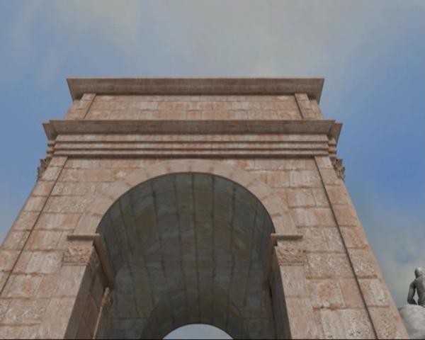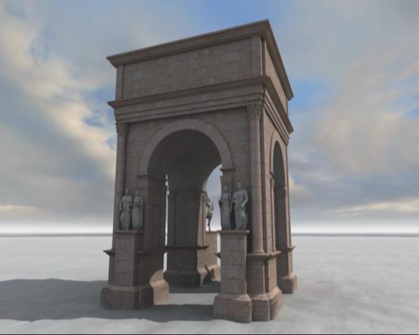 En el momento de su construcción tenía una altura aproximada de más de 13 metros, por lo que ejercía un efecto ciertamente monumental en el la trama urbana de la ciudad. En sus frentes este-oeste, es decir, los que corresponden al trazado de la Vía de la Plata, disponía de pedestales adosados sobre los que se colocaron esculturas de mármol que, posiblemente representaban a los padres del constructor o personajes de la familia imperial. Se ha señalado, incluso que las esculturas ubicadas en el frente oriental, pudieron ser ecuestres, teniendo en cuenta las dimensiones de los pedestales.