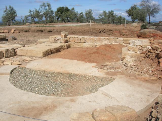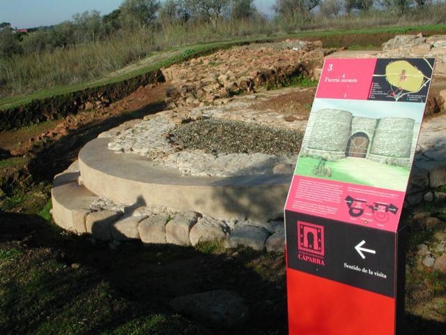 La ciudad romana de Caparra seguía este esquema clásico y contó, como mínimo, con cuatro puertas de acceso. La Puerta Sureste se dispuso al final del cardo maximus y servía de punto de entrada y salida hacia el Sur de la ciudad, comunicando además el núcleo urbano con el anfiteatro. Tenía una anchura de cuatro metros, aproximadamente, lo que permitía el tránsito de vehículos de carga y estaba flanqueada por dos torres, rematadas en potentes bastiones defensivo de planta semicircular. Las torres sustentaban un tramo de bóveda de cañón que conformaba realmente la puerta y daba continuidad a la muralla por su zona superior. No se ha podido determinar con seguridad la altura, pero la hipótesis apunta a un alzado de aproximadamente cuatro metros. El acceso al recinto urbano se realizaba a través de un tramo pavimentado con losas de granito que anteceden al umbral, en el que se aprecian unas hendiduras practicadas en la roca y destinadas al anclaje de los goznes de las puertas propiamente dichas. Ëstas, debieron realizarse con madera reforzada con elementos de hierro forjado. Por las huellas de uso se ha podido determinar que se abrían de dentro a fuera. En el interior de las torres se aprecian dos pequeños espacios que pudieron servir para establecer un servicio de control del acceso.