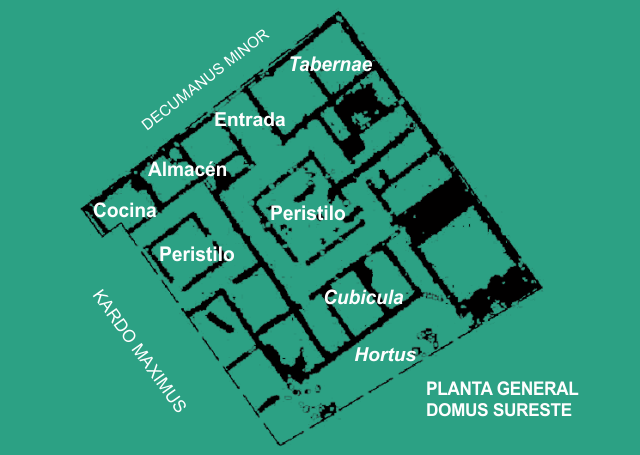 Por el momento, se han excavado dos manzanas (insulas) que se construyeron a ambos lados del Cardo Maximus. La primera está ocupada por una única vivienda cuya planta, de forma cuadrada, tiene una extensión de más de