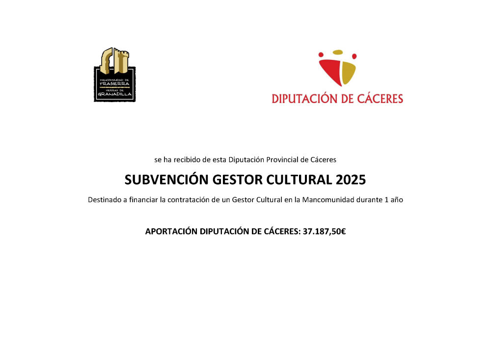 SUBVENCIÓN DE LA EXCMA. DIPUTACIÓN PROVINCIAL DE CÁCERES A LA MANCOMUNIDAD TRASIERRA TIERRAS DE GRANADILLA PARA LA FINANCIACION PARA LA CONTRATACION DE UN GESTOR CULTURAL